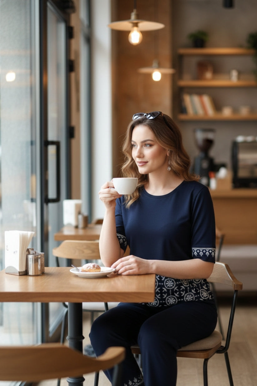 Navy Geometric White Contrast Border Print Night Suit Set