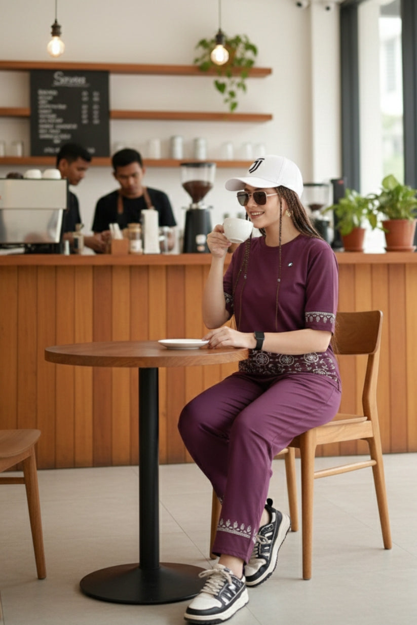 Wine Geometric White Contrast Border Print Night Suit Set
